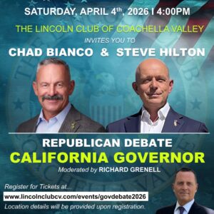 Ambassador Richard Grenell as the evenings Moderator The Lincoln Club of Coachella Valley is pleased to host Chad Bianco and Steve Hilton In their first Republican Gubernatorial Debate Moderated by Ambassador Richard Grenell 4:00pm Location details will be provided upon registration. Event Sponsor $10,000 Premium Table Sponsor $1,750 Table Sponsor $1,500 Individual Ticket $150.00 For […]